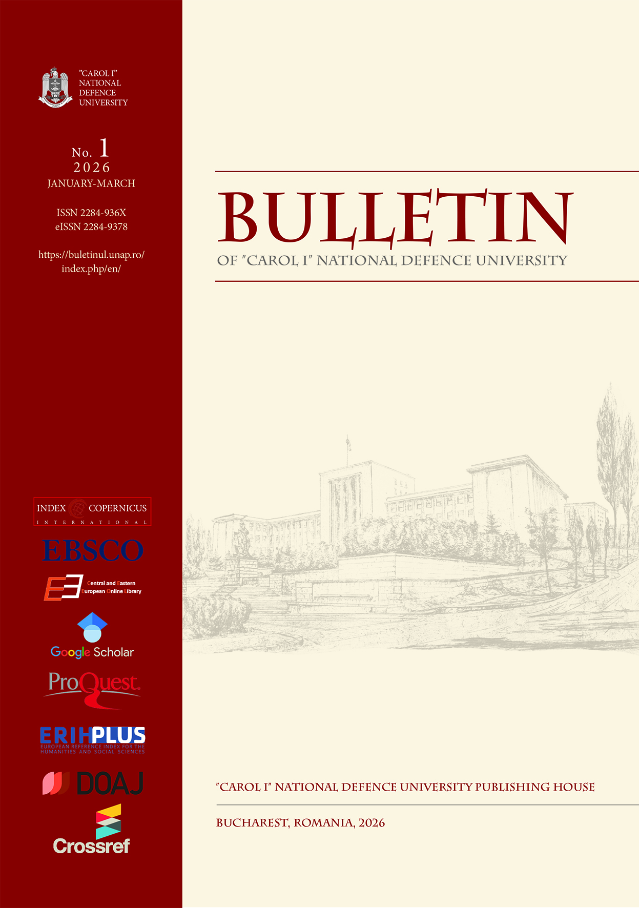 The Bulletin of "Carol I" National Defence University is a quarterly scientific open access journal dedicated to advancing science in the field of security and defence. While our main emphasis is on empirical research, we also welcome theoretical articles and reviews. We actively encourage interdisciplinary studies and international comparative analysis. Our goal is to foster military scientific research on a global scale, facilitating international dialogue and exchange of information among military and civilian researchers. All articles published in The Bulletin of "Carol I" National Defence University are indexed in various international databases and catalogues: Director of open access journals (DOAJ), EBSCO International Security & Counter-Terrorism Reference Center, ProQuest, Index Copernicus, Central and Eastern European Online Library (C.E.E.O.L),ERIH PLUS, Crossref (DOI)